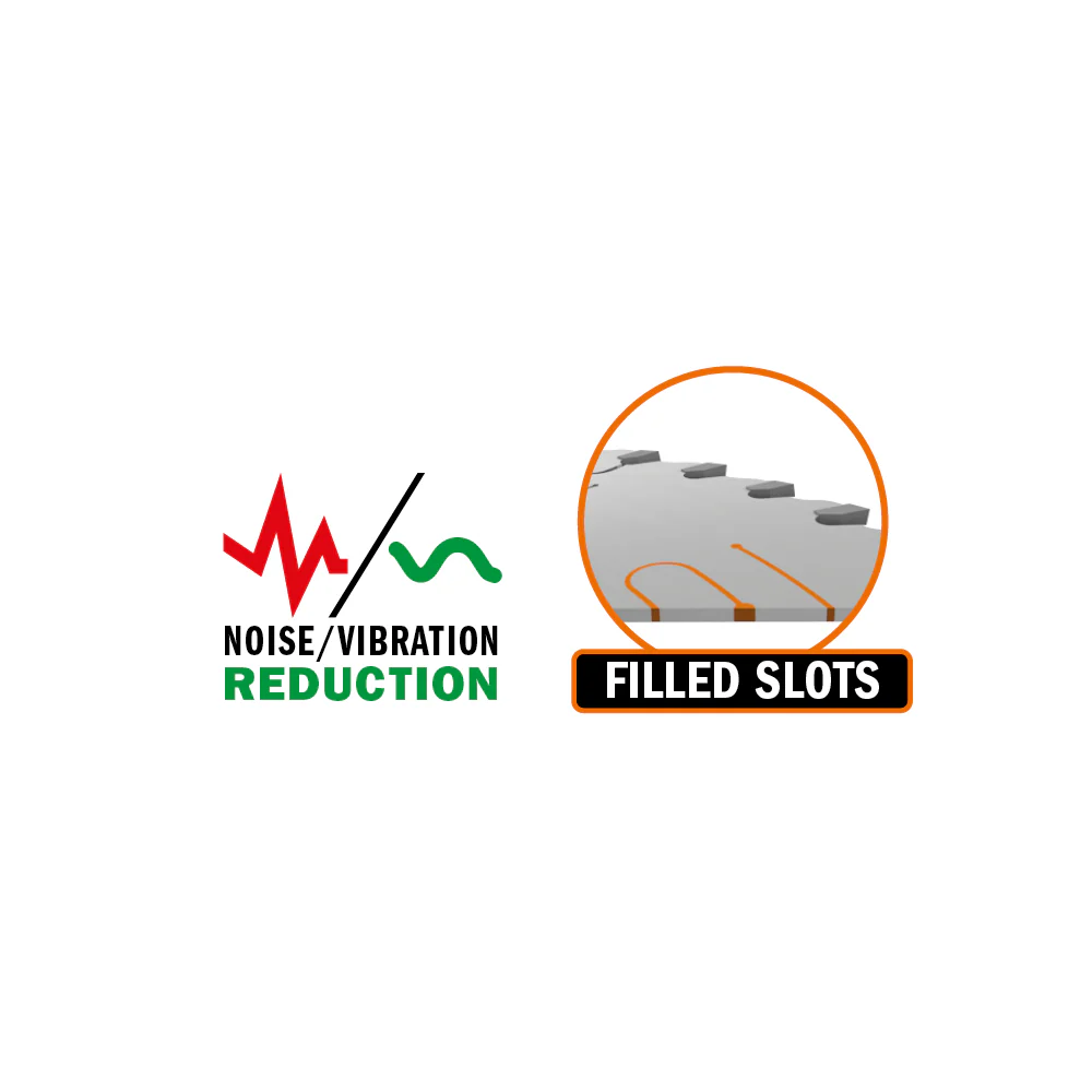 LASER-CUT SLOTS FILLED WITH SOUND-DAMPENING POLYURETHANE Damping polyurethane reduces vibration and noise by 25% compared to standard non-filled saw blades while improving cutting quality and extending blade life. Strategically positioned slots near the toothed crown provide superior vibration isolation and shock absorption. National Noise Emission Standard & Regulations compliant.