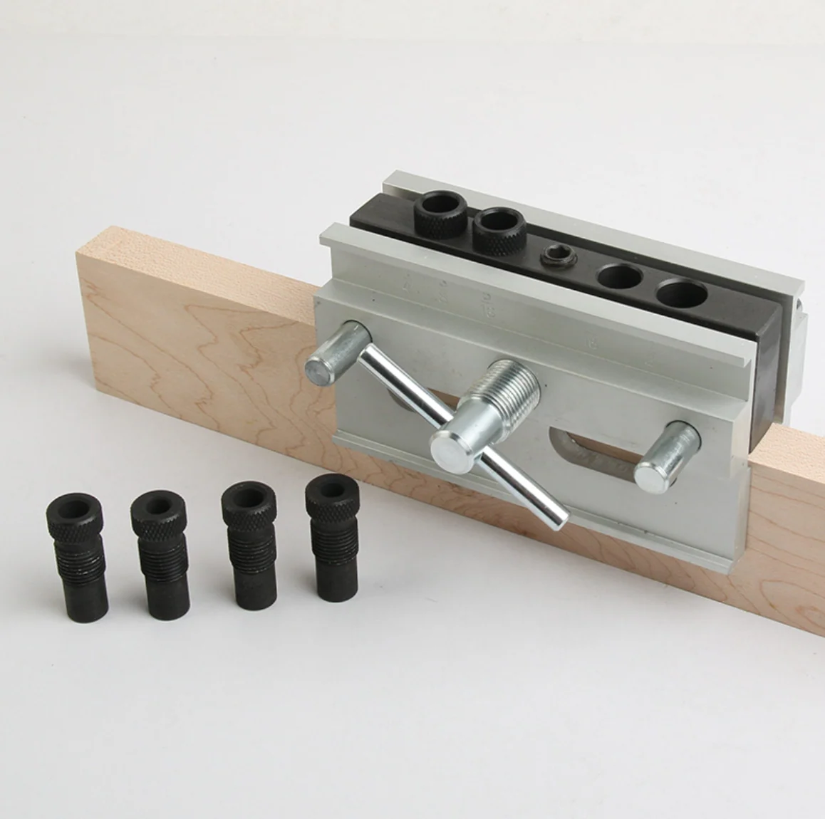 The pro grade jig tightens and self-centers on the edge of your workpiece, and the bushings let you accurately drill holes with common bit sizes from ¼” to a ½”.